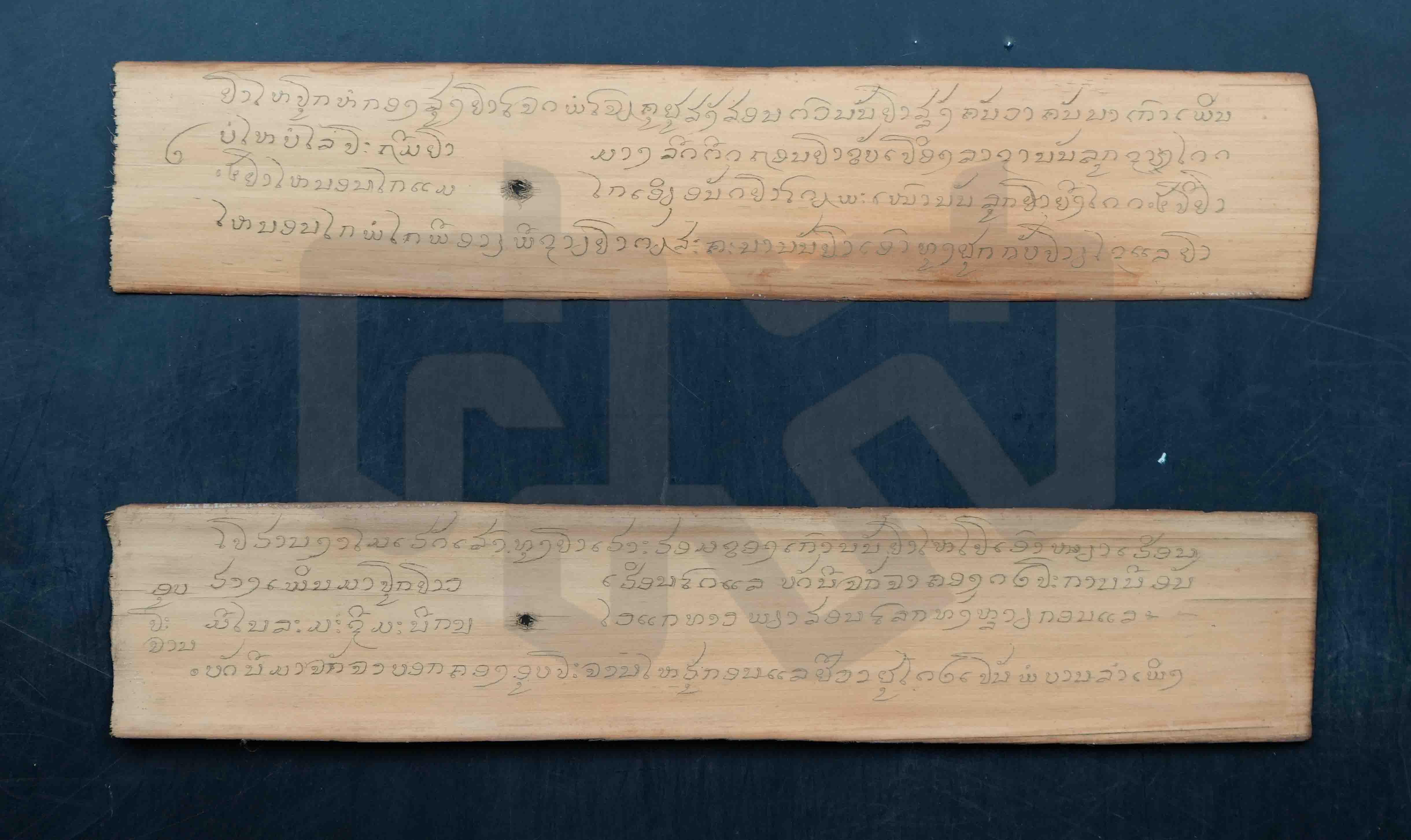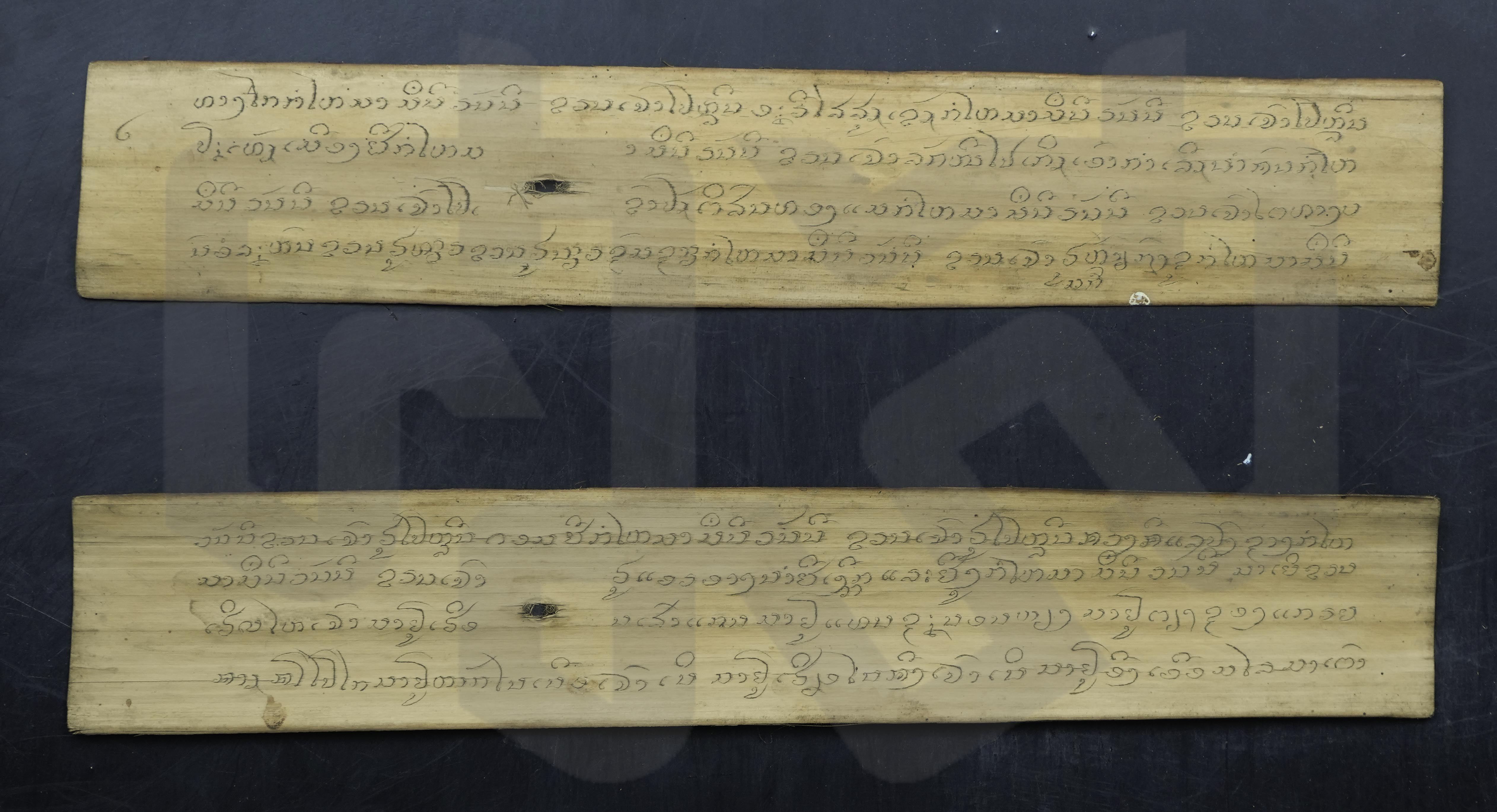 ใบลานสั้น ฉบับลานดิบ นอกจากนี้ยังพบข้อความระบุผู้สร้าง "เจ้าหัวอ้ายบัว" และ "หนังสือท่านหมื่นแสนเมืองจันท์กรมการเมืองด่านซ้าย"