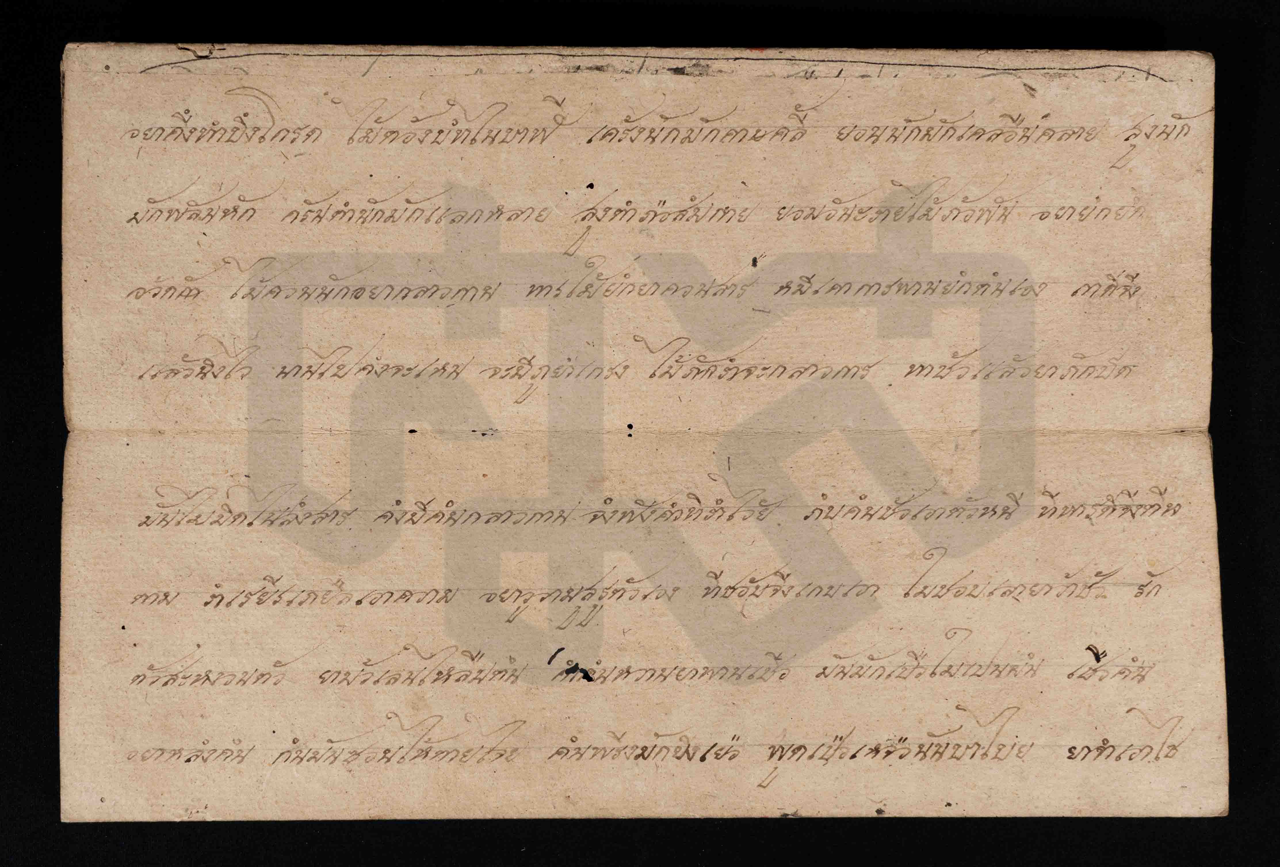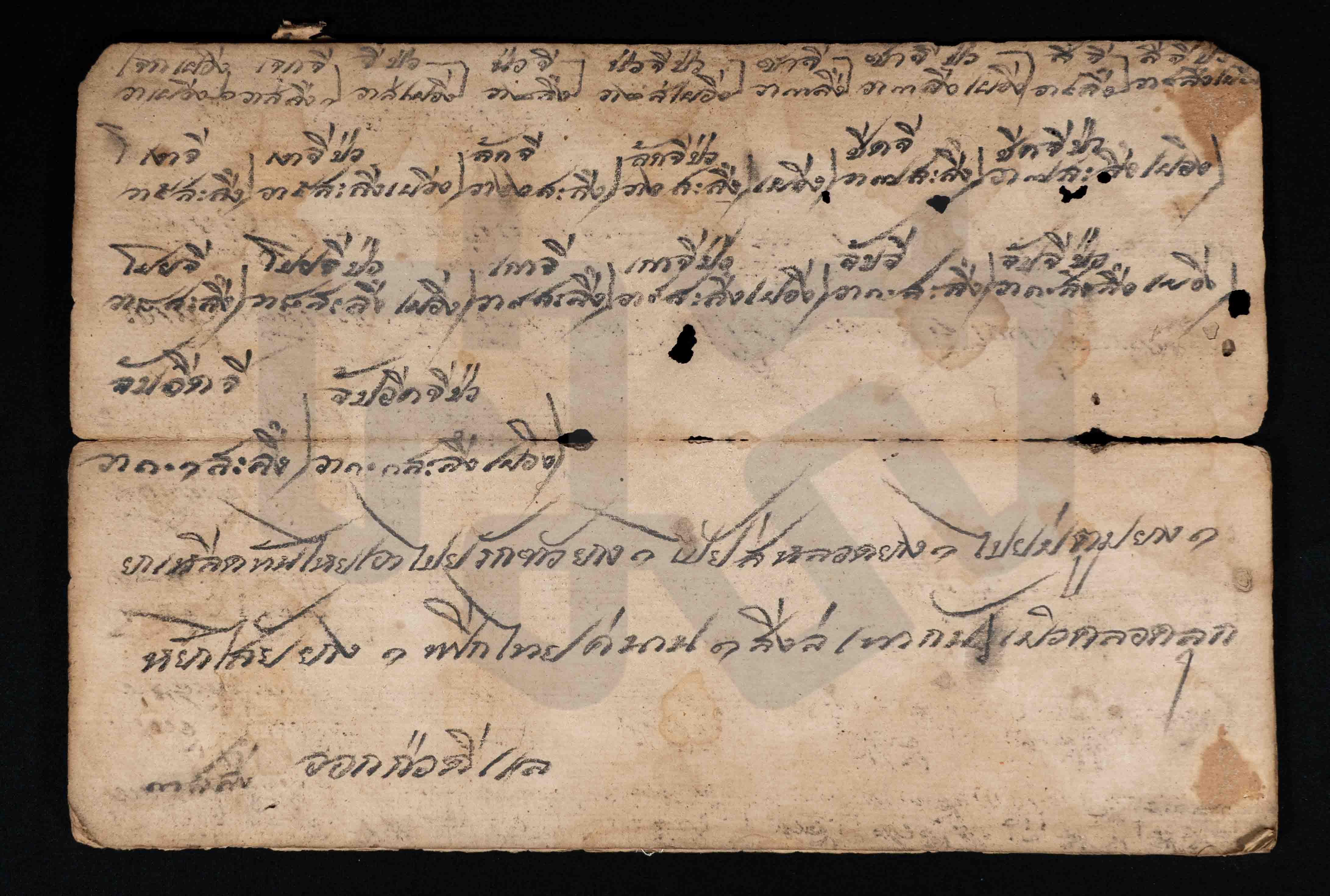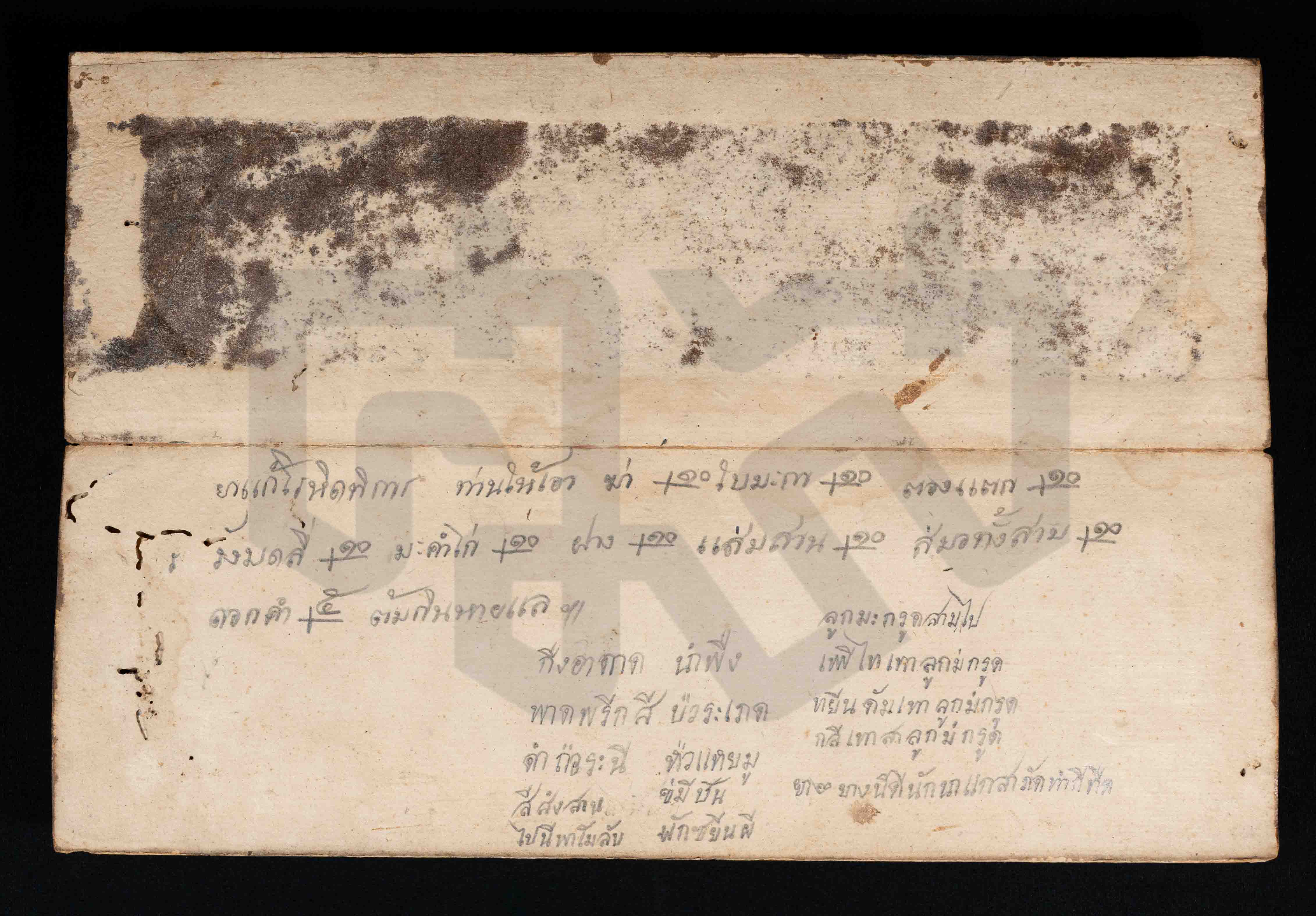 หน้าปกปรากฎข้อความว่า "บานชีย พ่อจาดข้ายเชื่อพาใหพู- มีชื่อชาย หญิง ไปปต้นบัยชีย ณ วัน ๖ ฯ๘ ๕ ค่ำ ปีมะโรงยังเป็นเอกศก เล่มนีเล่ม ๑ ||ะ", "เล่มนีเกบเงีนไดเสดบันชีแล้ว", "เรื่องราวสะมุนณี ถ้าคํนฎีจํงบูชา คํนรักชัวมันดาว้าแกลงกล้าวมัน นีว้าจะให้ดีหมีใช้ทีจะหมายมั่น"